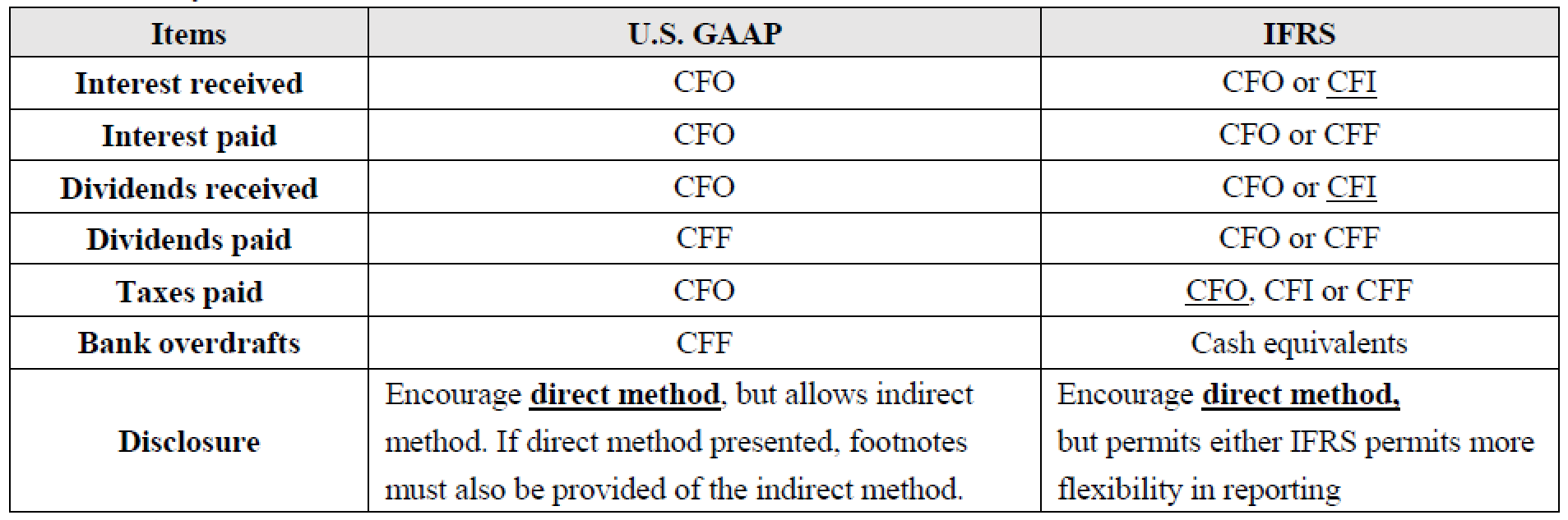 IFRS和US GAAP的现金流分类规则可能不同,见截图。