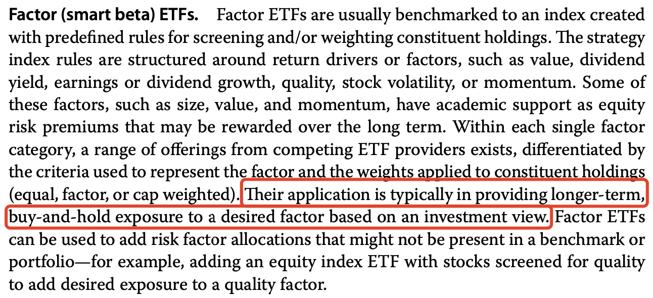 你好,16题是factor ETFs这个部分的知识点(见图),因为这类ETF更适合用来买入持有,因此不适合用来做短期战术性的交易。
