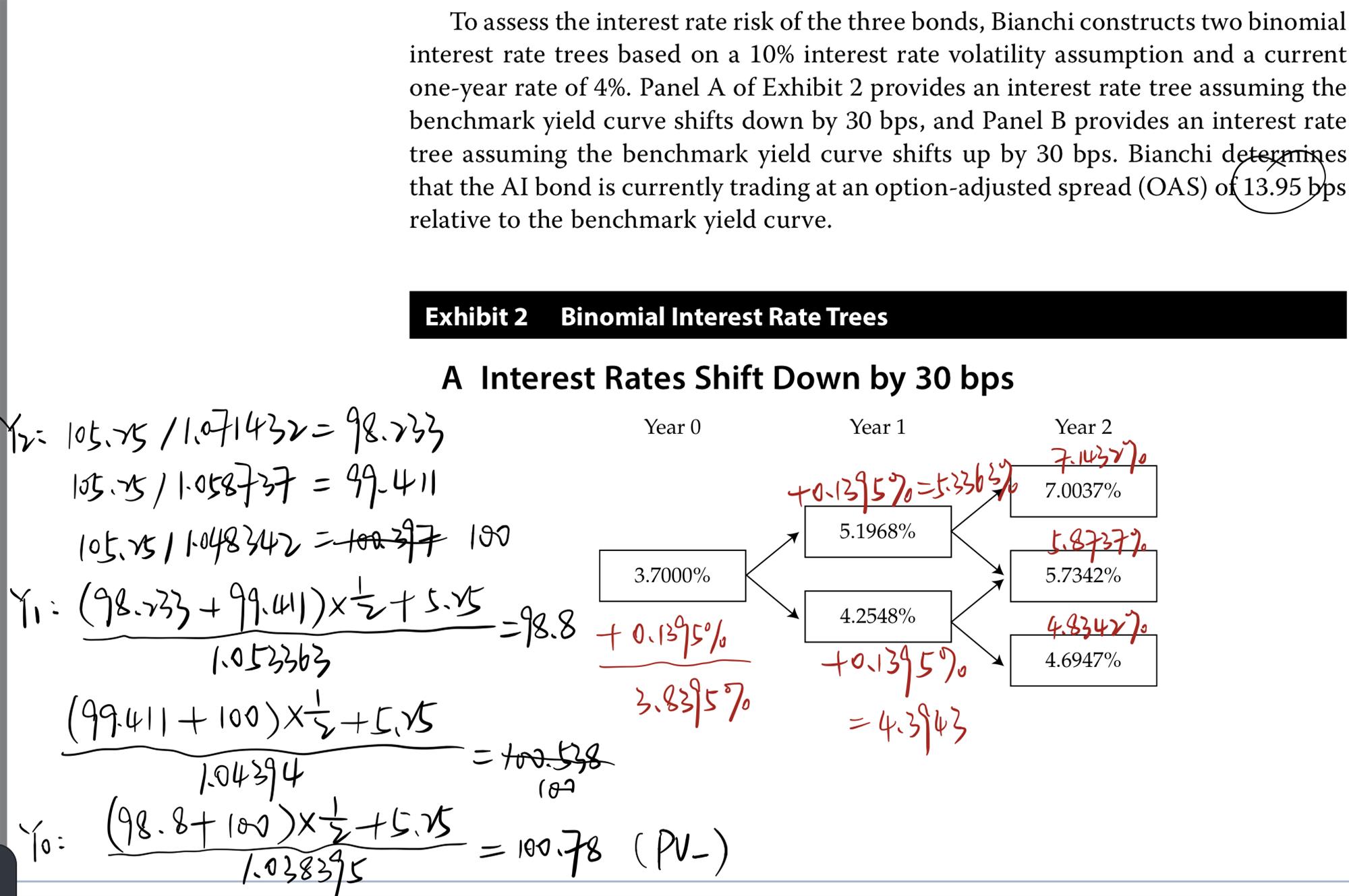 题目中给出信息“the AI bond is currently trading at an option-adjusted spread (OAS) of 13.95 bps relative to the benchmark yield curve.”所以需要在表2和3的每个利率节点上加13.95 bps。得到表2和3中的新的二叉树。