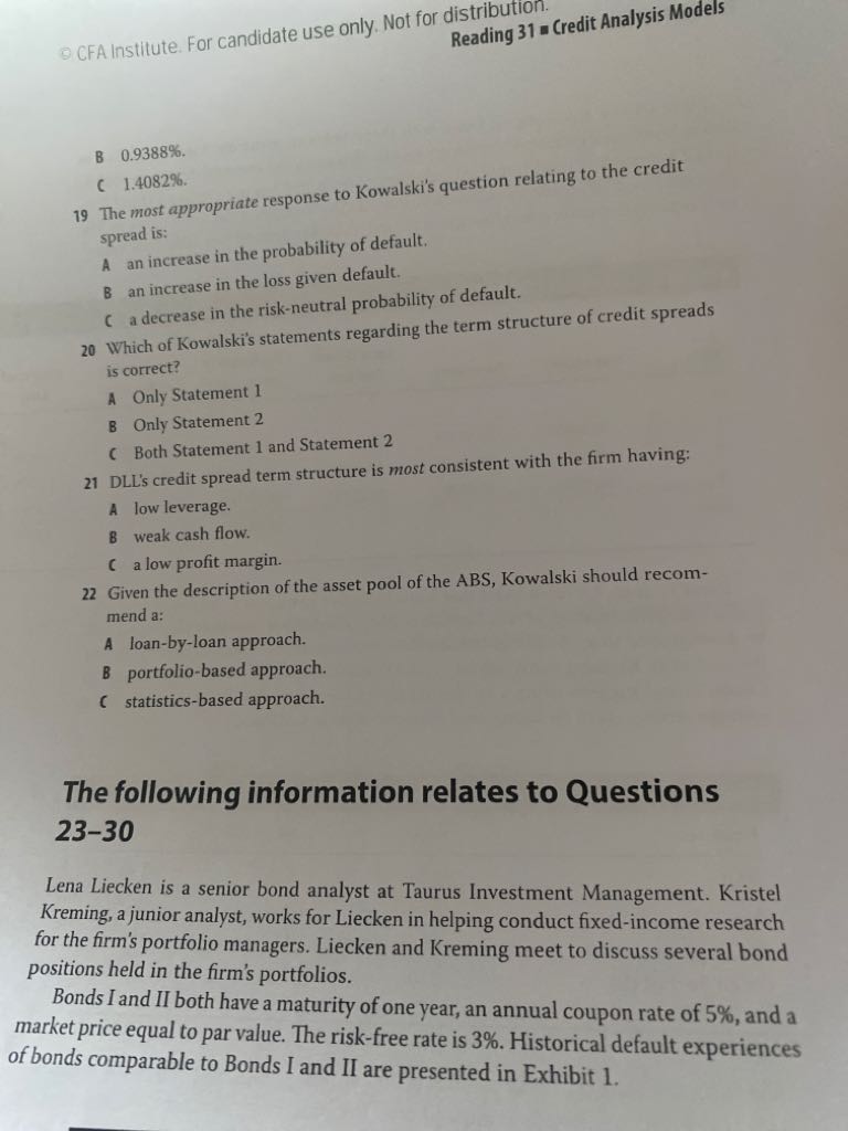 Q25:是预期未来价值的意思。如果没有违约,预计投资者将获得105;如果发生违约,投资者预计将获得105–[105×(1–0.40)]=42。因此,债券的预期未来价值是无违约和违约金额的加权平均值,即(105×0.98)+(42×0.02)=103.74。