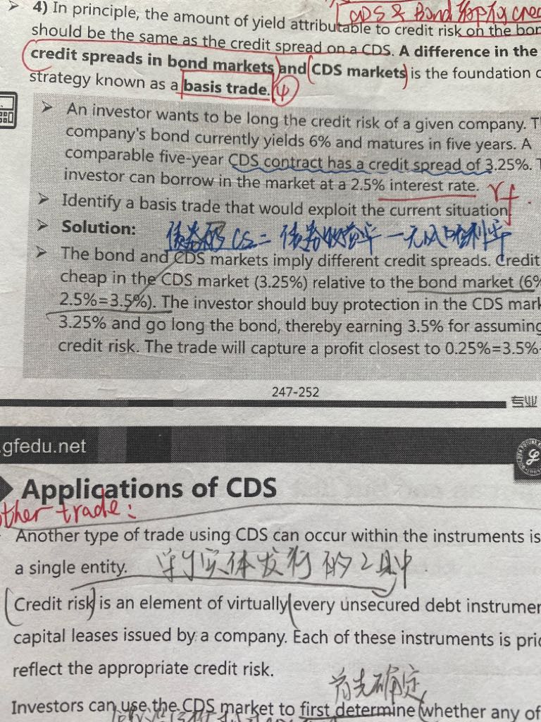 3. 债券的收益率为6%,无风险利率为2.5%,因此6%-2.5%=3.5%即为债券的credit spread,而市场中CDS的报价为3.25%。因此花3.25%买入CDS,买入债券收获3.5%的信用风险溢价。