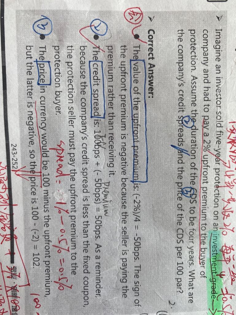 1.这说的就是CDS的标价方式,两个公式是一回事,只是改变了各项的位置。如果CDS price为102,upfront premium=100-102=-2%,代表CDS的买方要在期初一次性向卖方支付2%。