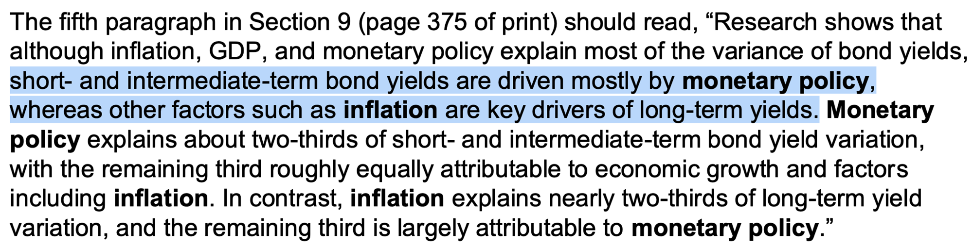 你好,正确的说法应该是短期利率主要受货币政策的影响,长期利率主要受通胀和经济增长的影响。原版书一开始在这个表述上出现了错误,但是后来有进行勘误,见下图。考试的时候以这道课后题的讲解为主。
