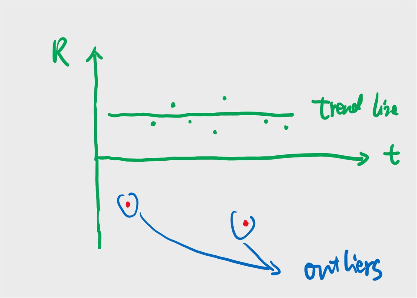 同学你好,趋势线就是一条体现当期平均收益率的现,如果是正态分布的,那么收益率应该在这条趋势线的两边紧密分布的。但因为factor 1尖峰会导致肥尾,分布又是负偏的,因此会导致出现很多大的negative outliers。所以,它的收益率并不是紧密围绕趋势线的。