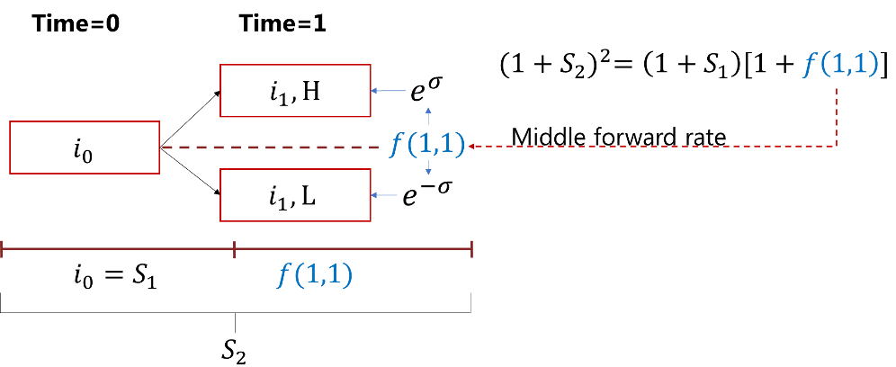 你好,1. 构建利率二叉树的方法如下图,二叉树上time 1的中点就是1年期的远期利率,远期利率可以从即期利率曲线中得到。得到一年期的远期利率后就可以构建二叉树,二叉树上相邻两个节点上的利率相差e^2sigma,因此time 1上面节点的利率是f(1,1)e^sigma,下面节点的利率是f(1,1)e^(-sigma),两年期二叉树同理。都是从当年的中点远期利率出发,找到其他节点的利率,掌握构建思路即可,考试的时候利率二叉树都是直接给出的,不要求考生构建二叉树。