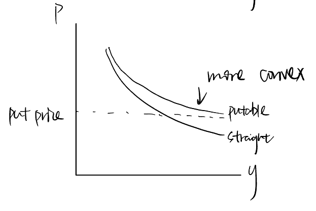 你好,convex是凸,concave是凹。putable bond的价格有地板,不会低于put price,所以putable bond比straight bond在凸性中的表现为more convex,见下图。