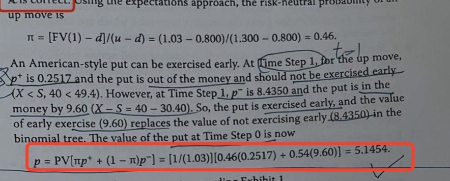 你好,原版书中的答案是错的,但是过程是对的,这题应该选B。美式期权的价格到下图红色框那里就结束了。