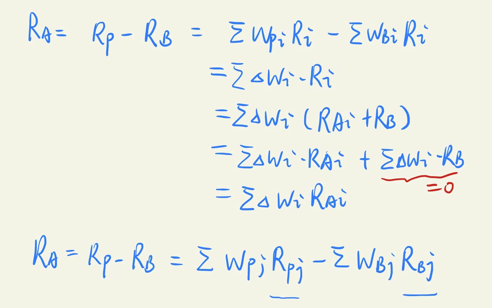 同学你好,RA=Δwi*(Rpi-Rb)当投资于同一类资产,只是具体证券的投资权重和基准不同导致的RA