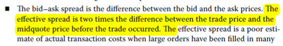 同学你好,原版书summary里面的effective spread的定义更加清晰,就是(trade price-mide quote price)*2(for buy order)。如果是sell order,就是(mide quote price-trade price)*2,所以它和bid ask spread一样,是价差的概念。