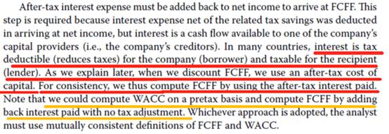 原版书上也说了,可以把tax saving算在FCFF中,这是FCFF要再加一个int*Tax rate,但此时WACC必须用税前的WACC即WACC= wd × rd + (we × re),但第一种是更普遍的算法。