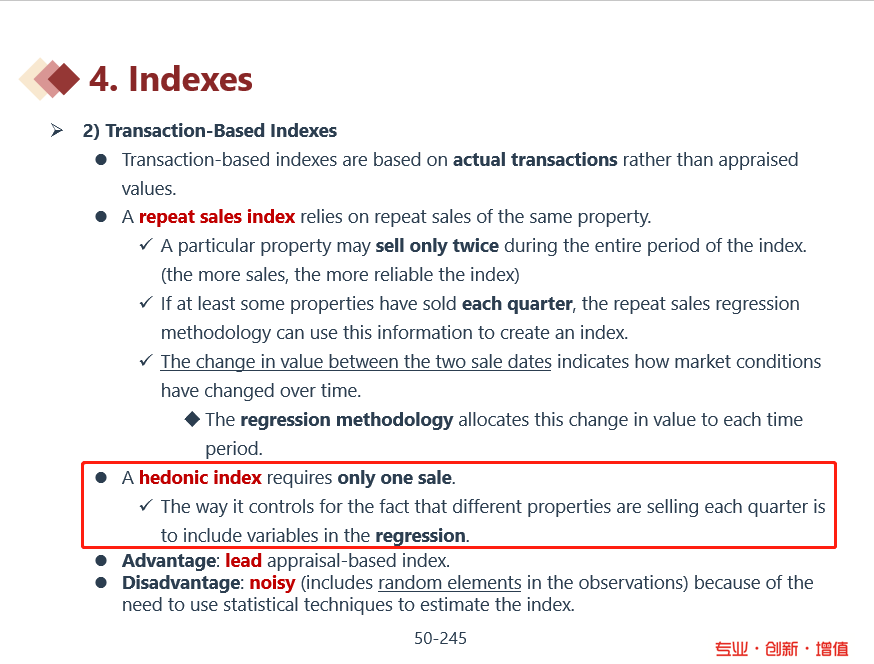 你好,hedonic index叫享乐指数,它属于transaction based index的一种。也是基于真实交易,这种指数只需要房地产进行过一次交易即可。在交易房产的时候是有价格的,但是期间是没有价格变化的,因此这种方法会使用回归的方法,把中间的房价变化补充上。回归是通过房产的不同特征作为变量(例如:面积大小、年代、建筑质量和位置等),通过回归分析可以确定这些变量对物业价值的影响。