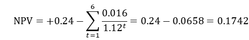 初始投资减少0.24(考虑增量现金流),折旧6年,每年折旧金额减少0.04。根据公式(S-C)(1-T)+TD, TD =0.04×0.4=0.016。