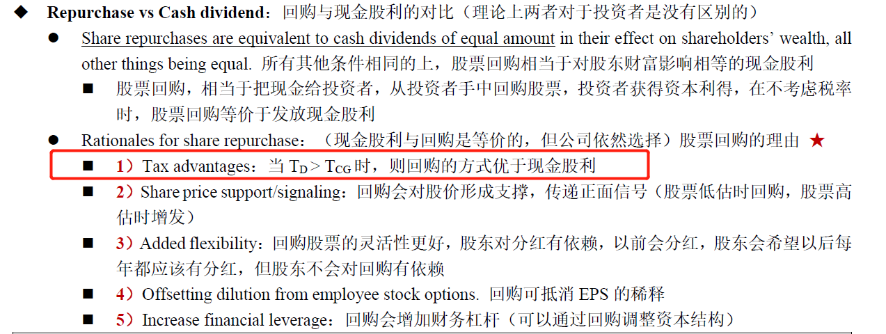但如果资本利得税率低于股利税率时,回购是更好的,因为股东交的税要少一些。