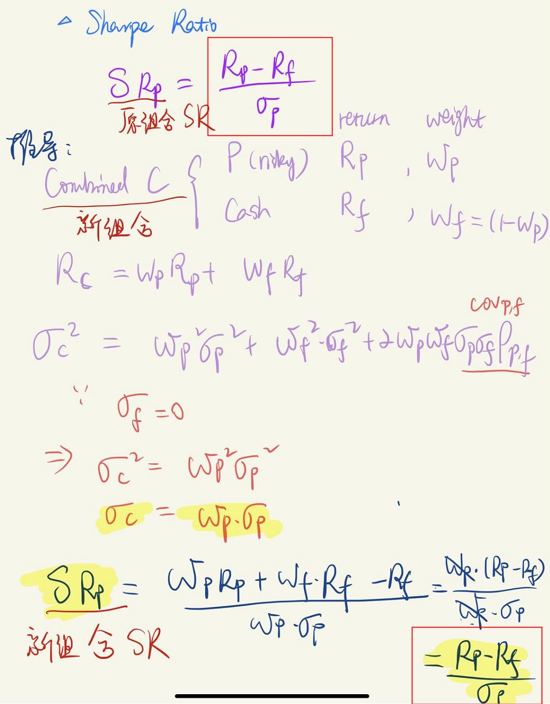同学你好,是一样的。因为配了cash之后,分子上的rp-rf会下降,分母上的标准也会下降,因为cash获得的是无风险收益率,我们认为是没有波动的,因此和组合结合之后会降低组合整体的收益的波动。下降幅度相同,所以SR还是不变的。具体的推到可以参考下图。