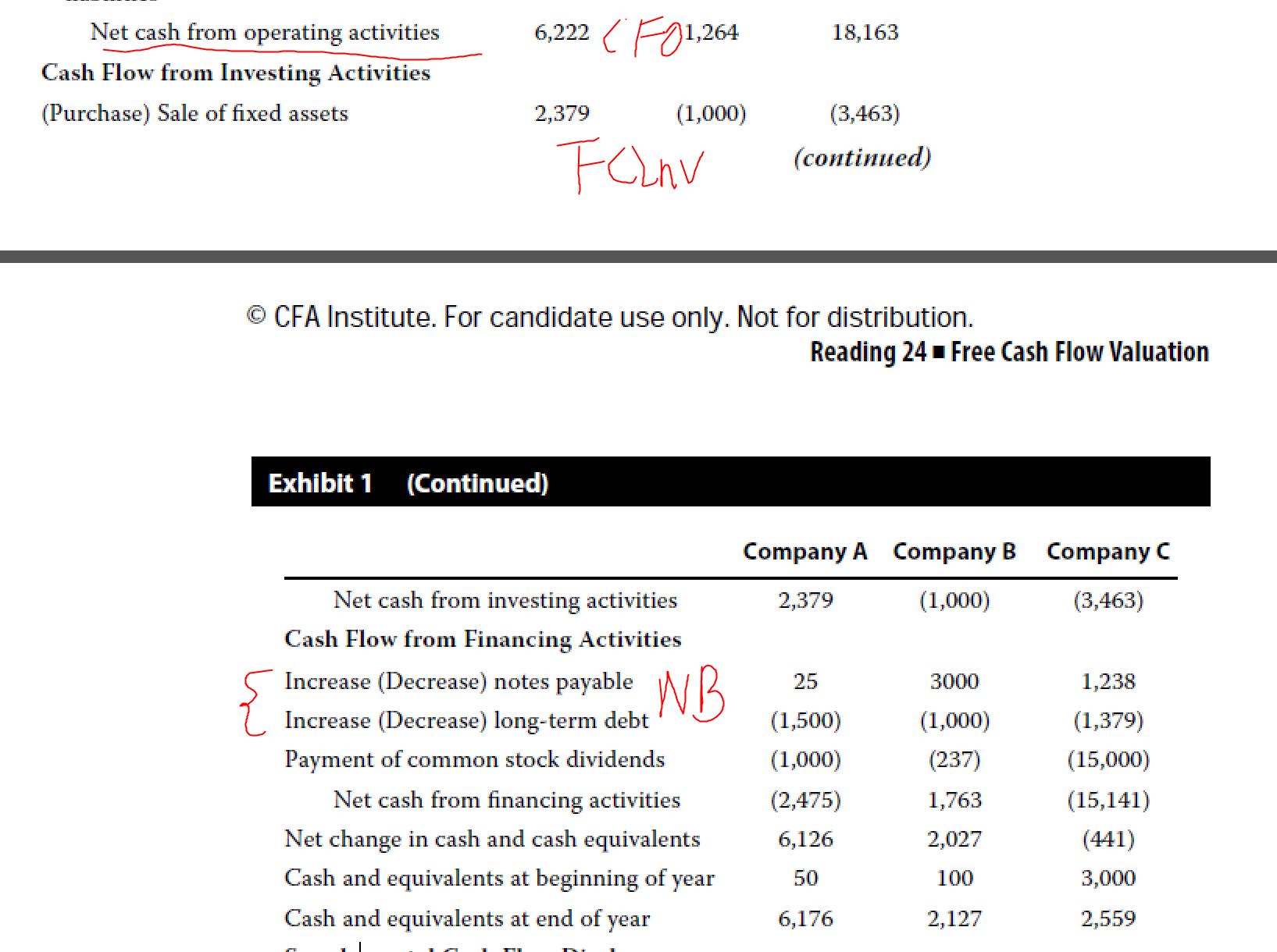 这里需要注意,因为题目中给出的表格是现金流量表,因此CFO、FCINV、NB涉及项目直接按表中现金流方向相加即可。