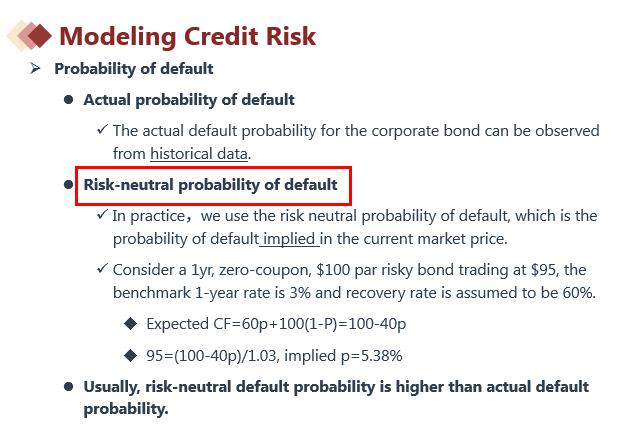 同学你好,这里是关于Risk-neutral probability of default的定义概念,折现回来等于现在的价格,算出来这个概率就是风险中性违约概率。见下图讲义。为乘风破浪的你【点赞】👍让我们知晓您对答疑服务的支持!~