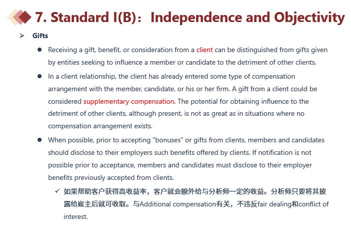 同学你好,可以参考下图。你帮客户达成高收益,客户额外给你些酬劳,这个是属于additional compensation而不属于VI(A),如果获取雇主的书面同意后那么就可以收取。利益冲突比较常见的案例是分析师在写某个公司研报时,他自己就买了这个公司的股票;或者是分析师与标的公司的某个高管有个人关系、分析师是标的公司董事会成员、分析师所在公司与标的公司存在业务往来,这些情况都是常见的利益冲突,在做投资推荐时一定要披露,否则别人会以为你是由于自己的私人利益才推荐相关股票。还有就是客户是长期投资者,但是公司的激励政策是基于短期的投资业绩,这种激励政策也需要披露给客户的。