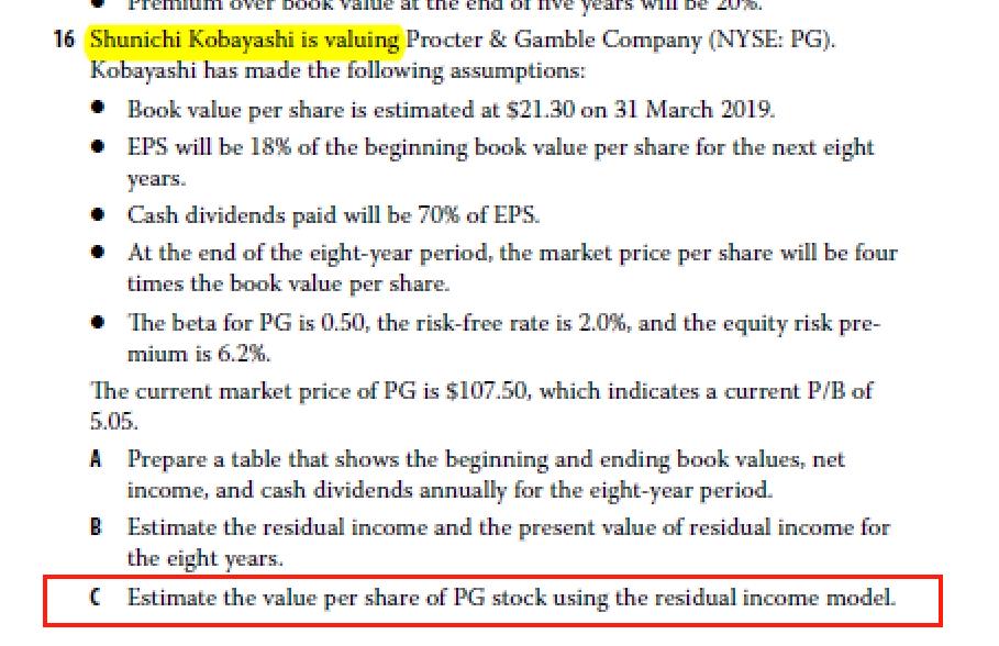 当ROE回归到行业平均值,分析师会预估一个在T时刻企业的P/B即PT/BT(考试的时候会给出,所以这个P/B是哪一年的,那么这个T就是哪一年的)。因此在T时刻公司的价格就是(PT/BT)*BT = PT; 那么剩余价值就是超过当时账面价值的部分,即PT -BT。相关题目可以参考R26课后题16题的C小题这个到降到industry mean level其实是总结出来的,实际题目中用这种算法的并不一定会有这样的表述,甚至我至今没看到题目中有降到industry mean level这个说法的。