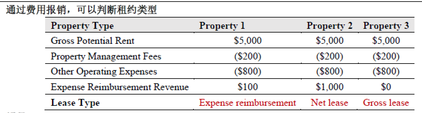 3、如果expense reimbursement revenue为0,说明是gross lease,运营费用由房东承担。