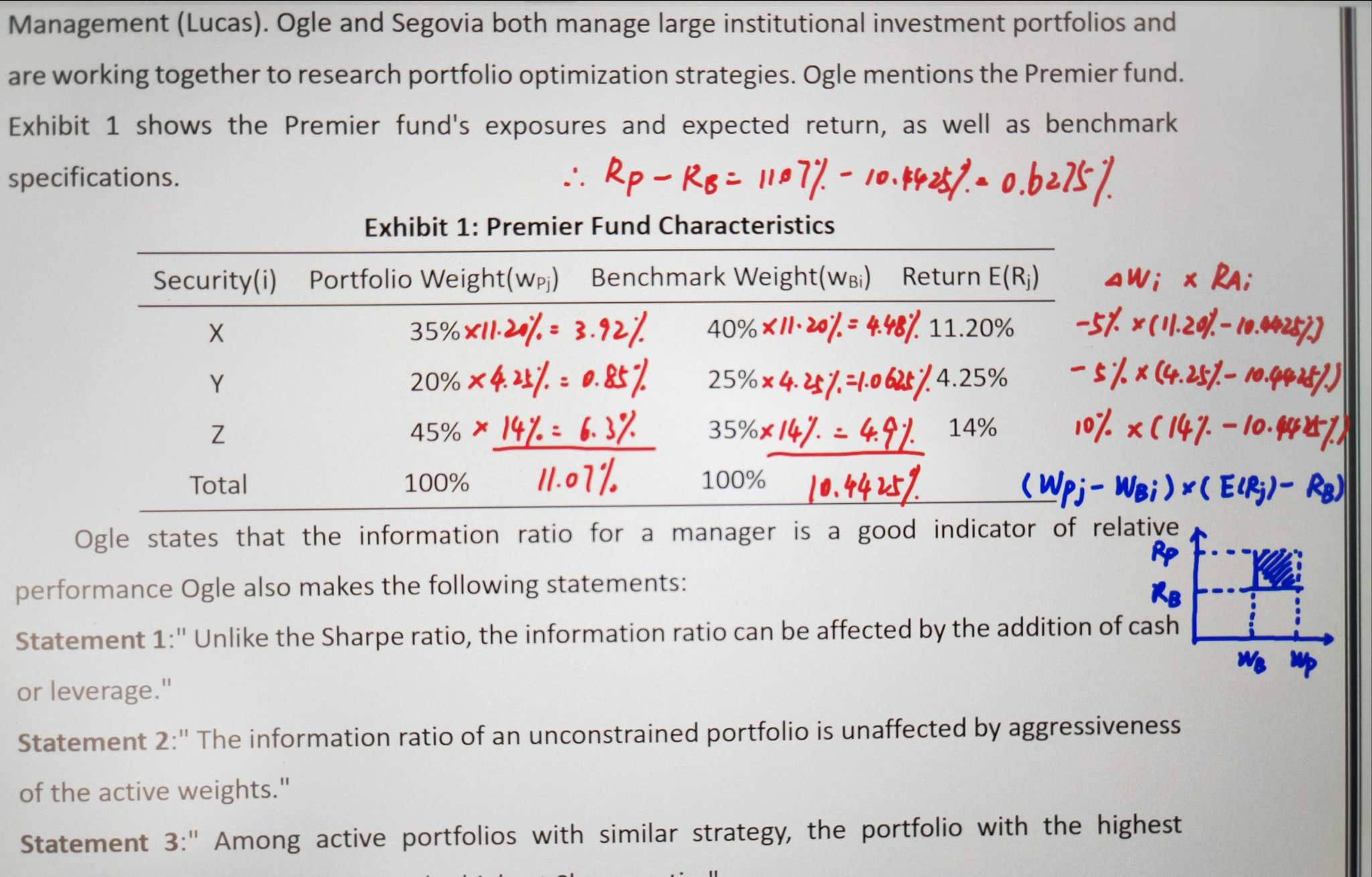 谢谢老师,第一个问题我明白了,那第二个问题,如果根据讲义上的图,感觉应当是蓝色阴影的部分,那这部分也不是主动管理的回报呀?请问老师讲的方法二为什么会和方法一Rp-Rb得出的结果相同呢?