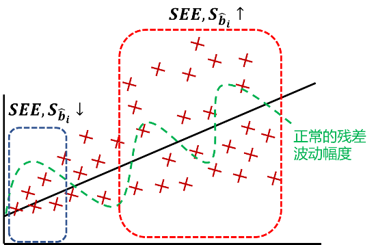 相应的如果取后端的数据做样本,残差的波动将会超过正常的波动范围,从而导致SEE增大,sbj变大,此时显著性检验更不容易拒绝原假设,易犯二类错误。