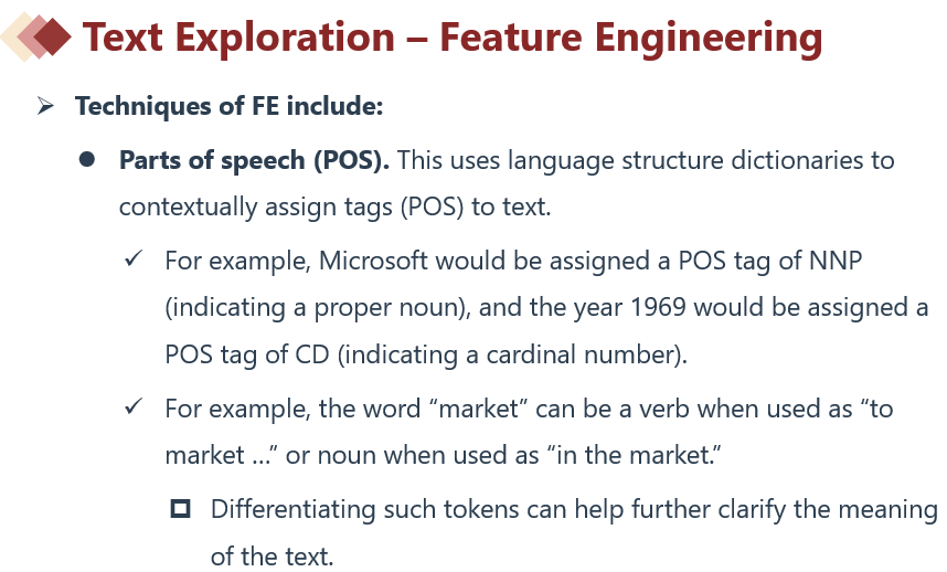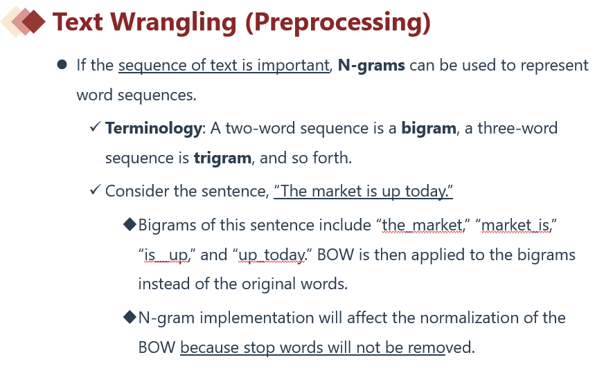 原版书的Module 7 Big Data Projects的EXAMPLE 5 Textual Feature Representations for ML Model Building 的两个问题都没有看懂,基础课上也没有讲到相关知识。1. Describe three textual feature representations that Lee and Kim should consider for their text data. 和2. Describe a rationale for adopting each of the three textual feature representations identified in Question 1. 求讲解,谢谢!