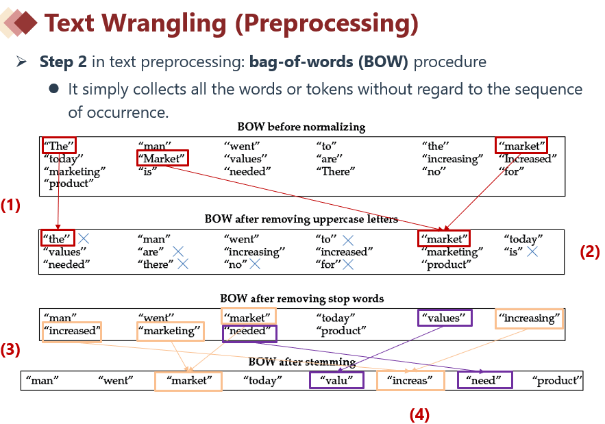 1. 在数据被清理和标准化之后,可以应用词包(BOW)程序,该程序只收集所有单词或标识符,而不考虑出现的顺序。一般都是探索文本特征的起点。