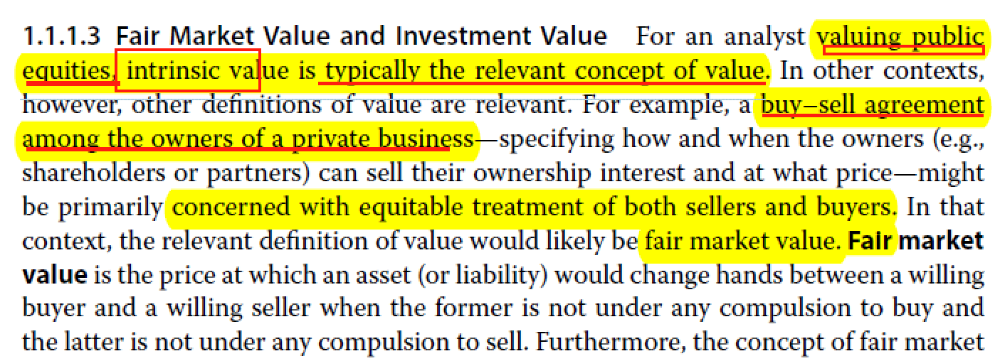 而如果是考虑非公开交易的股权,那么用fair market value更多,因为这个value是有意愿和有能力的买卖双方,在信息对称且自愿的情况下认可的交易的价格。private equity是需要考虑交易双方的意愿,且是要公平对等的。