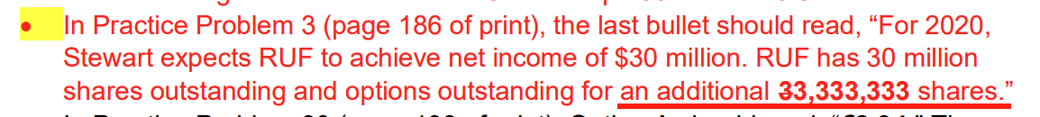 For 2020, Stewart expects RUF to achieve net income of $30 million. RUF has 30 million shares outstanding and options outstanding for an additional 33,333,333 shares. --> 总的number of shares 不应是30mil+ 33.33mil么,为什么答案只用了33.33mil?
