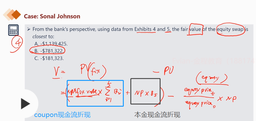 请见以下视频解析截图,固定端是所有未来现金流折现求和,分成了蓝色coupon和黑色本金两个部分计算