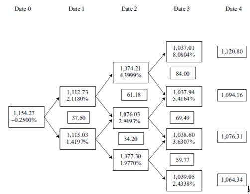 债券4为浮动利率债券,每个利率节点都需要加上quoted margin 4%,利用题干表3信息,计算出假设无违约情况下债券价值,计算结果如下图,所以expected exposures for Dates 1=(0.5 × €1,112.73) + (0.5 × €1,115.03) +37.5=1151.38