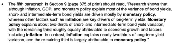 这里原版书在后期进行了勘误:Monetary policy explains about two-thirds of short- and intermediate-term bond yield variation, with the remaining third roughly equally attributable to economic growth and factors including inflation. In contrast, inflation explains nearly two-thirds of long-term yield variation, and the remaining third is largely attributable to monetary policy.
