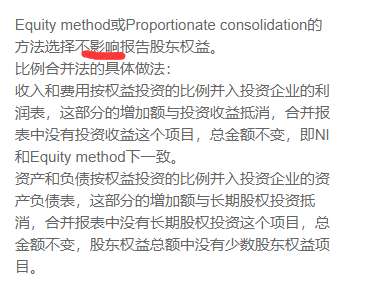 是不是说,权益法下equity比起合并前还是有变化的,只是变化后的权益法、按比例合并法的equity是相等的?