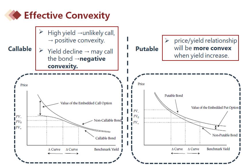 当含权债券可能行权的时候意味着in the money。所以利率下降,callable会行权,那么就处于in the money。同理当利率上升的时候,putable会in the money。