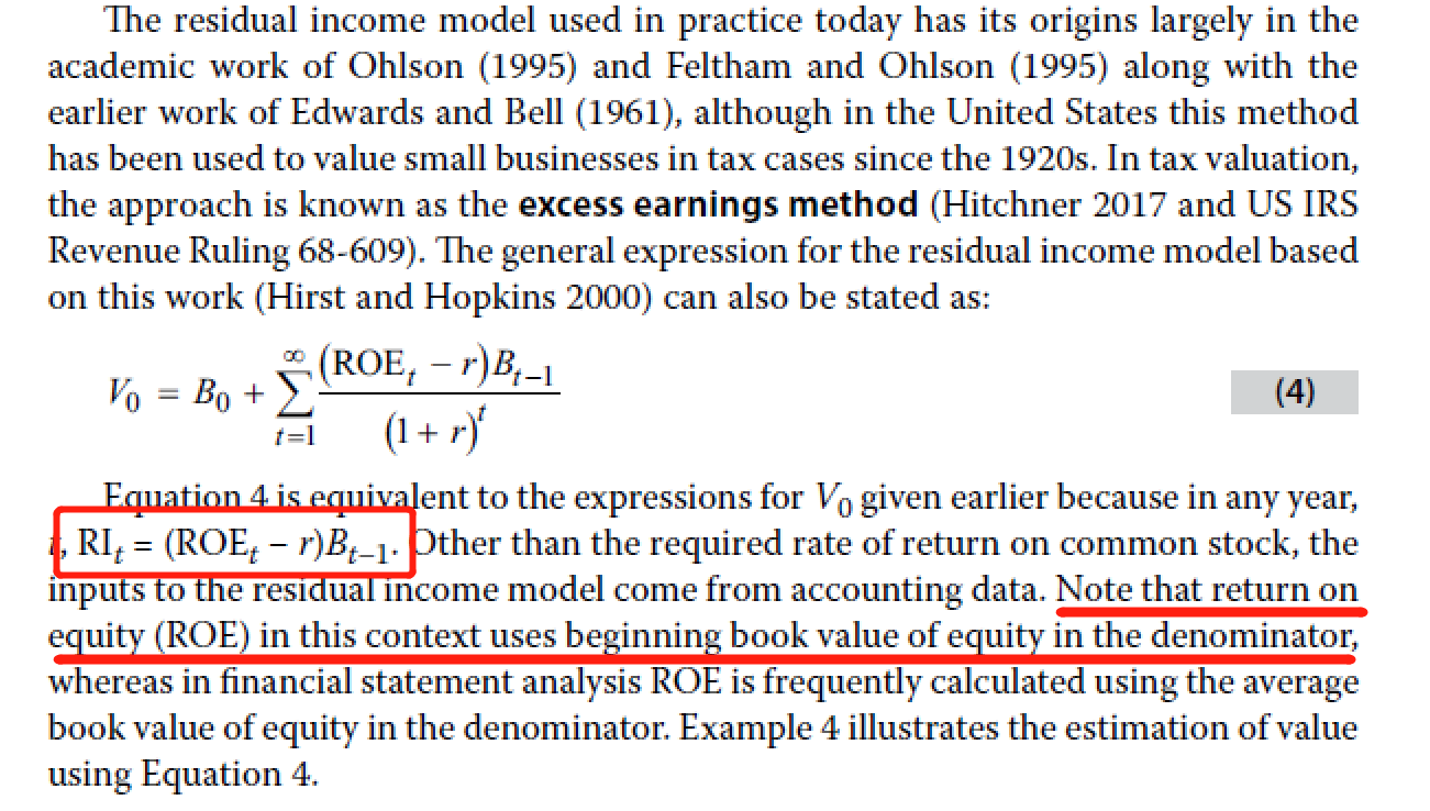 我现在就不太明白,为什么这里要引入每年的ROE来计算呢?t年的ROE知道了,那t年的NI和前一年的B都知道,直接用NI来计算不更好吗?这样反而绕了一个弯子