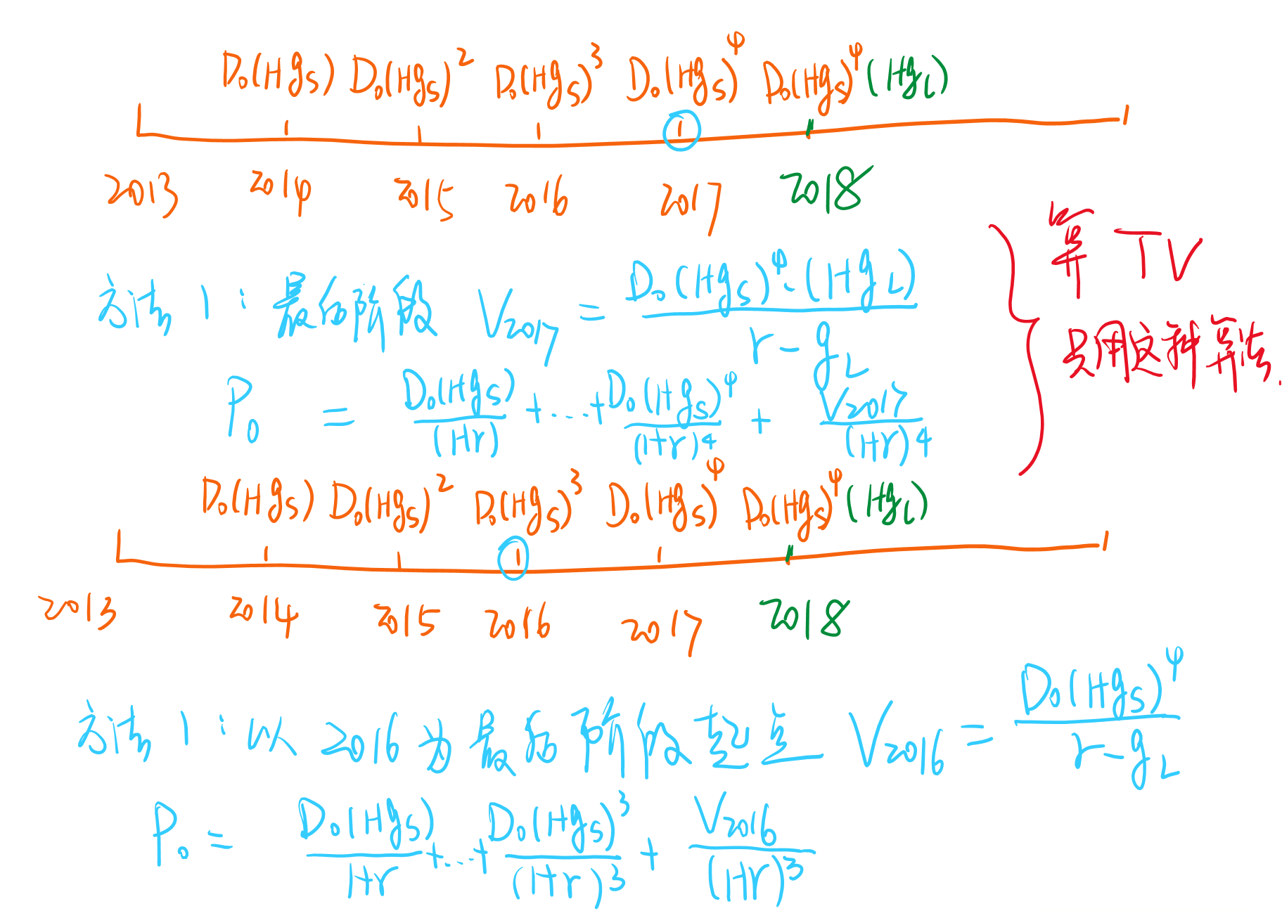 此题不论是算V2016,还是V2017,这两种方法算出来的TV不同,但股价相同。同学可以都试着计算一下。