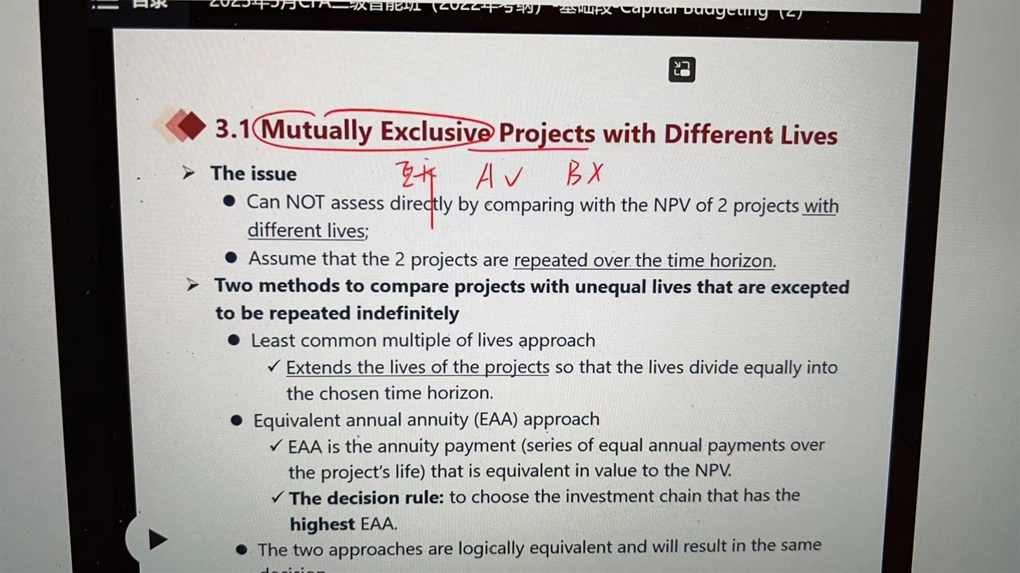 EAA这是在22年考纲的(具体出现位置如下图,capital budgeting2),如果同学是23年考纲的考生,同学可以忽略这部分的练习(课后练习的入口在刷题***)。