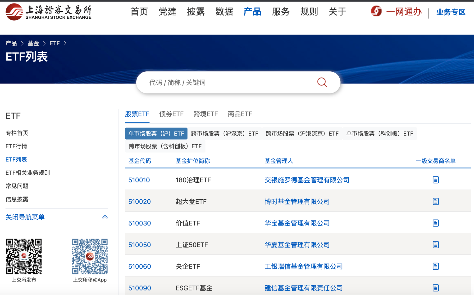 ETF的全称是交易所交易基金,它可以在二级市场进行交易,交易的方式和股票一样。上交所的官网就提供了很多ETF的代码和其他信息。
