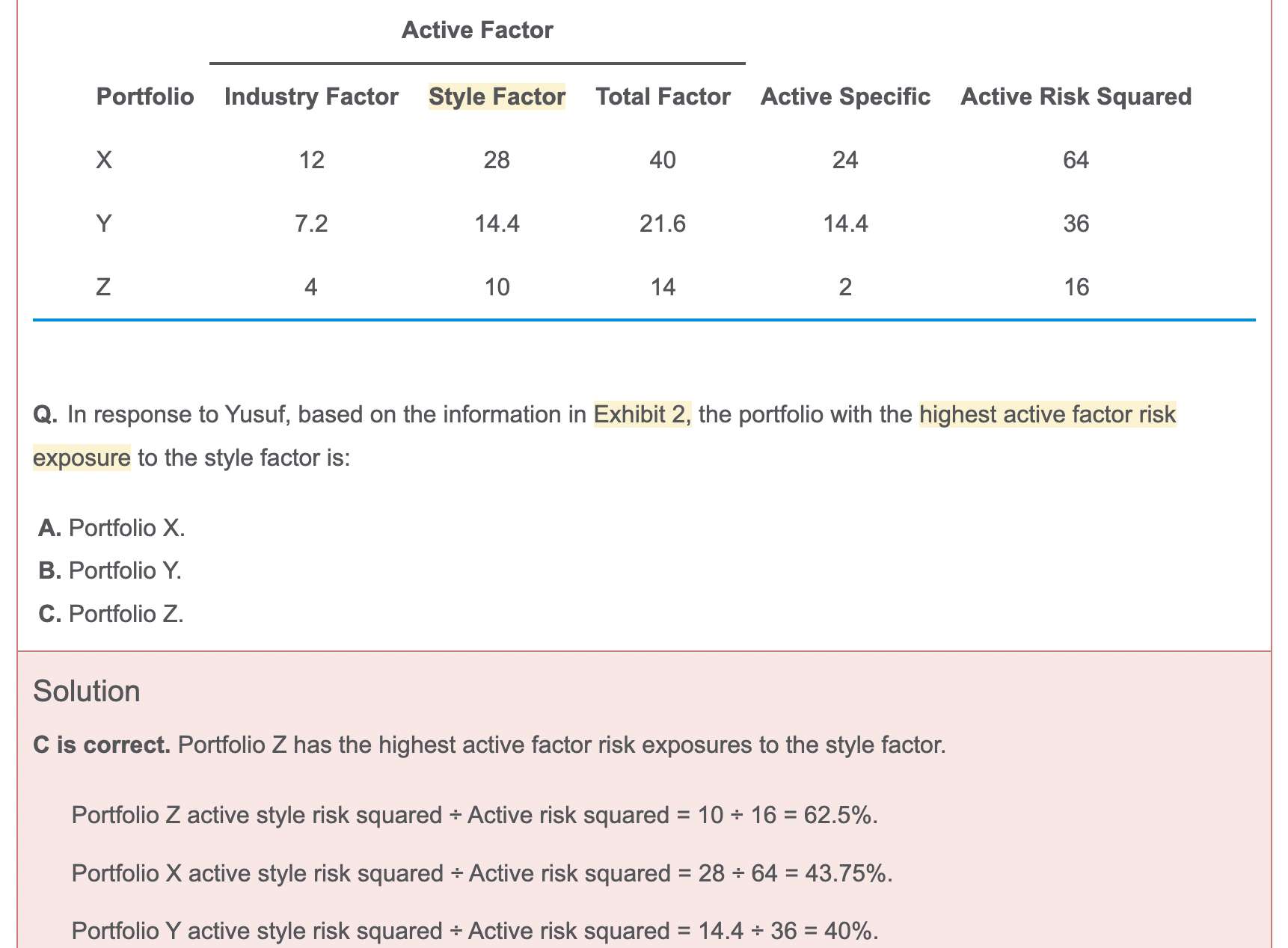 Essie老师,不好意思,我贴错图了,是这题哟。我记得这个我之前问过的,只是因为推后考期,我的学习系统可能reset导致我找不到之前的解答。昨天一开始重做这题是做错了,后来我再认真思考了一下,应该是对应active factor risk + active specific risk = active risk squared的考点。这一题问的是active factor risk中,style factor risk在active risk squared的占比?是这样吗?上次做这题是大半年前,可能这个知识点我不够牢固,有劳老师再解答一下哈,谢谢。