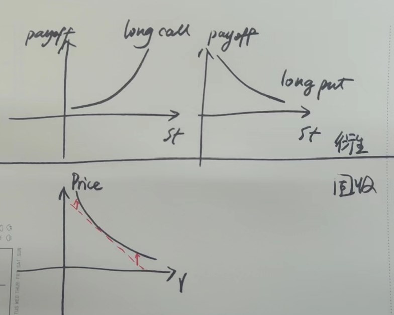 从图形上理解来说,不管是long call option 还是long put option,它们的价值都是涨的快,跌的慢(可以看下下面的图),所以都是凸性,所以它们的二阶导gamma大于0。另外,凸性在固定收益中称为“涨多跌少”,或者凸性。