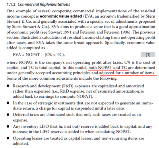 EVA其实也是一种residual income,只它属于RI的商业应用,EVA这个说法被注册了商标的,是属于Stern Stewart & Co.的。