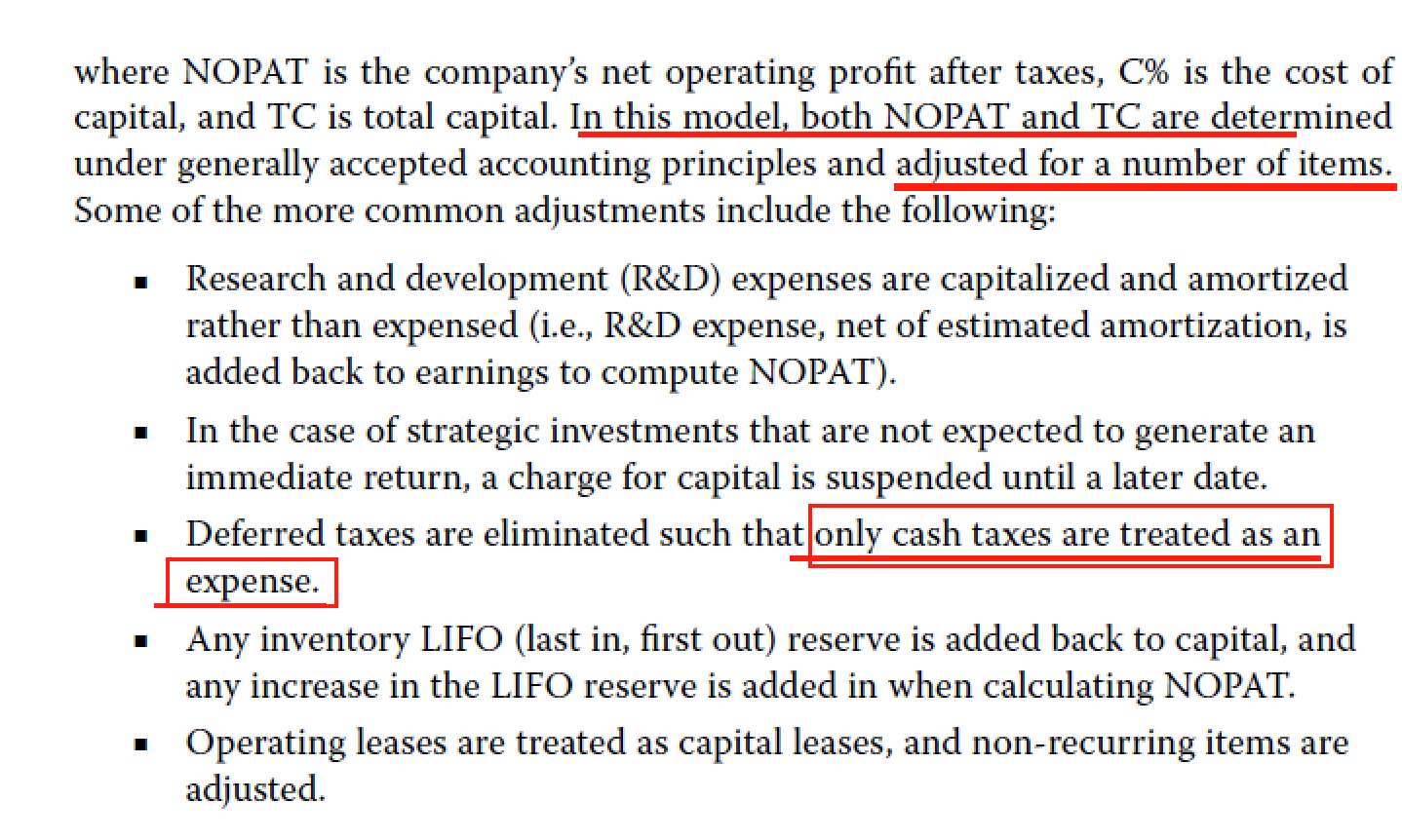 其中一项就是在计算NOPAT的时候,税减的时cash tax,也就时实际交的税金,因此时考虑了抵税部分的。同时,减去cash tax也使得税的部分免于会计处理方法的影响。