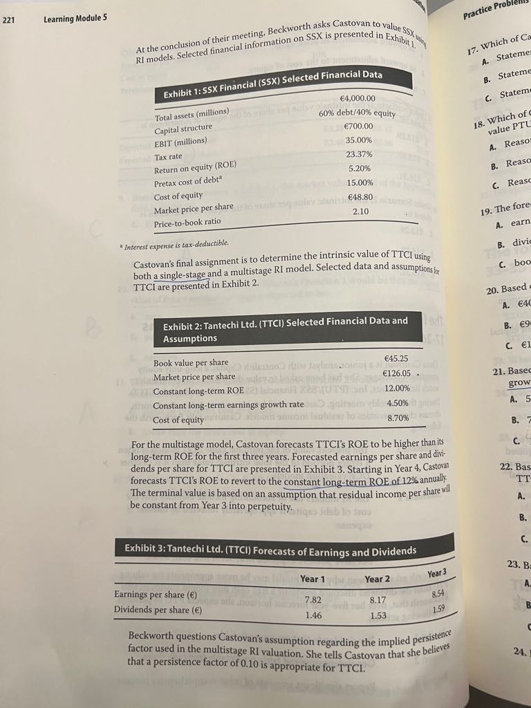 1)residual income =NI-B*re= €373.9 million – €4,000 million × 0.40 × 0.15= €133.9 million.