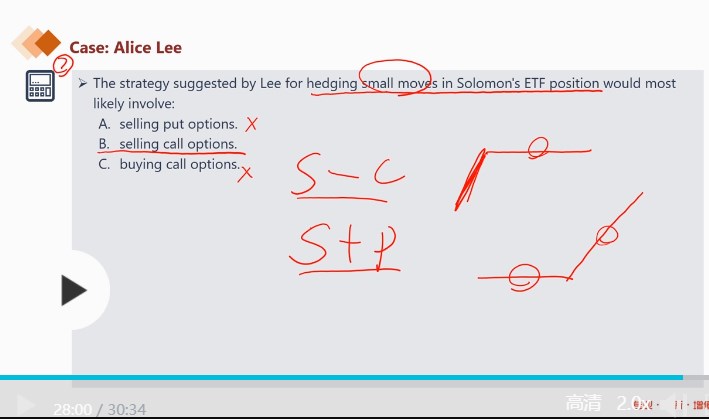 相关内容在视频解析28分左右,“long stock, short call”的图像如截图所示