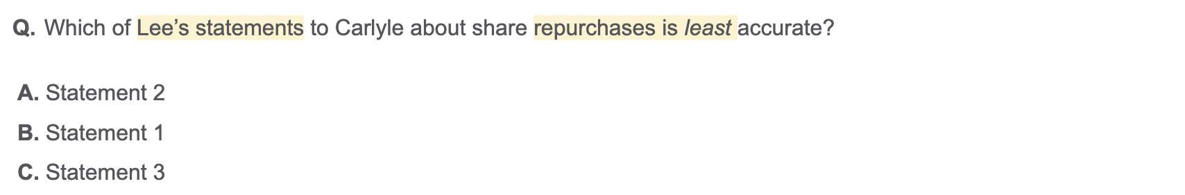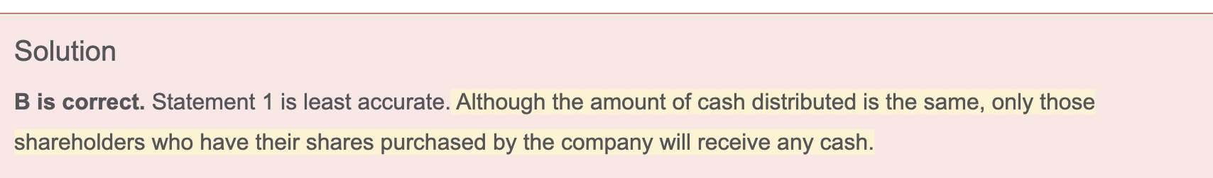 谢谢lm老师。即是:any cash received by shareholder(i.e. distribution of cash among shareholders)≠ cash dividend received by shareholder,原因是现金股息是是向所有股东发放(分配)的,而有些现金(特指公司回购股票支付的现金)是仅分配给那些股票被回购的股东。所以,statement 1应该改为“The distribution of cash among shareholders is not equivalent to what would have otherwise been distributed to them as dividends because such distribution is different from the distribution of cash dividend.”是这样理解吗?