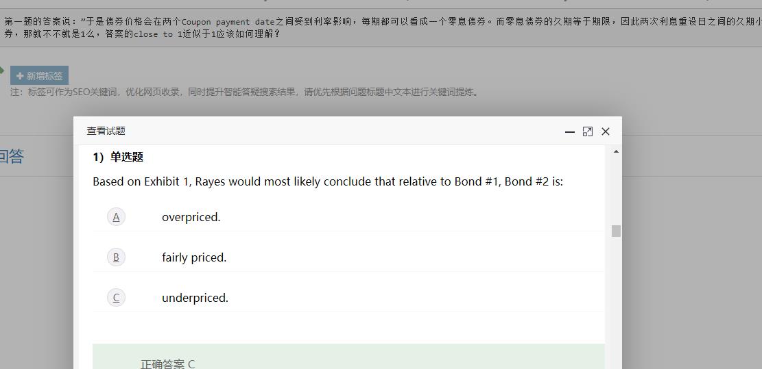 第一题的答案说:”于是债券价格会在两个Coupon payment date之间受到利率影响,每期都可以看成一个零息债券。而零息债券的久期等于期限,因此两次利息重设日之间的久期小于等于一年。“ 如果浮息债券等同于一年期的零息债券,那就不不就是1么,答案的close to 1近似于1应该如何理解?