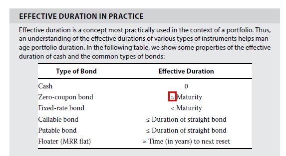 这里我们通常所说的零息债券久期等于期限,这是理论上的说法。实际在实践中计算的时候,精确的说法就是约等于,也就是close to 的概念,可以记一下。