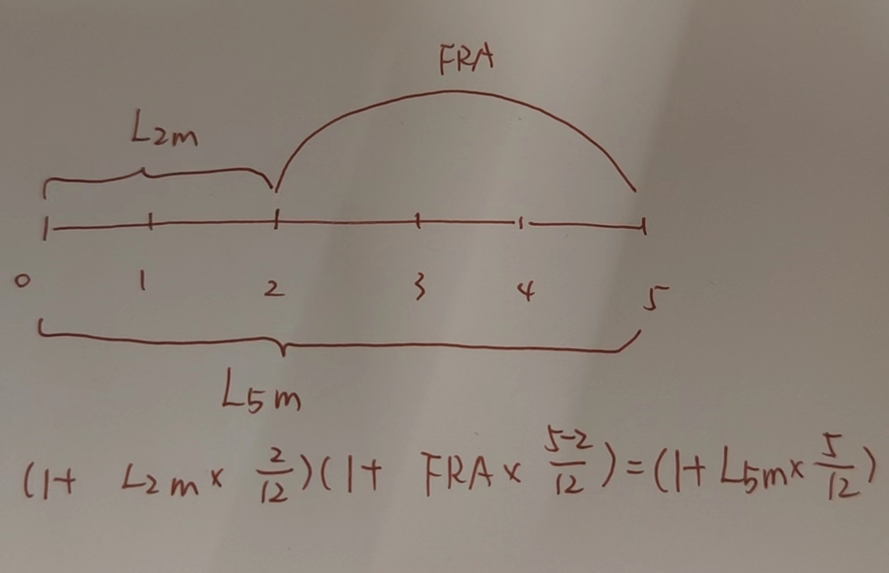 我是按照原版书来的,用0-5除以0-2的spot rate得出2x5的fra,但是最后还要乘以4(我看1*4的fra也是一样)请问乘以4这个4代表的是什么