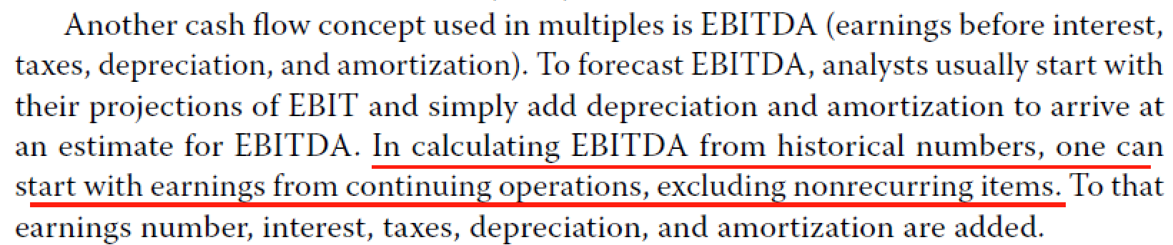 同学你好,EBITDA的计算也需要normalize,即剔除nonrecurring items。剔除完nonrecurring items的NI就是NI from continuing operations.