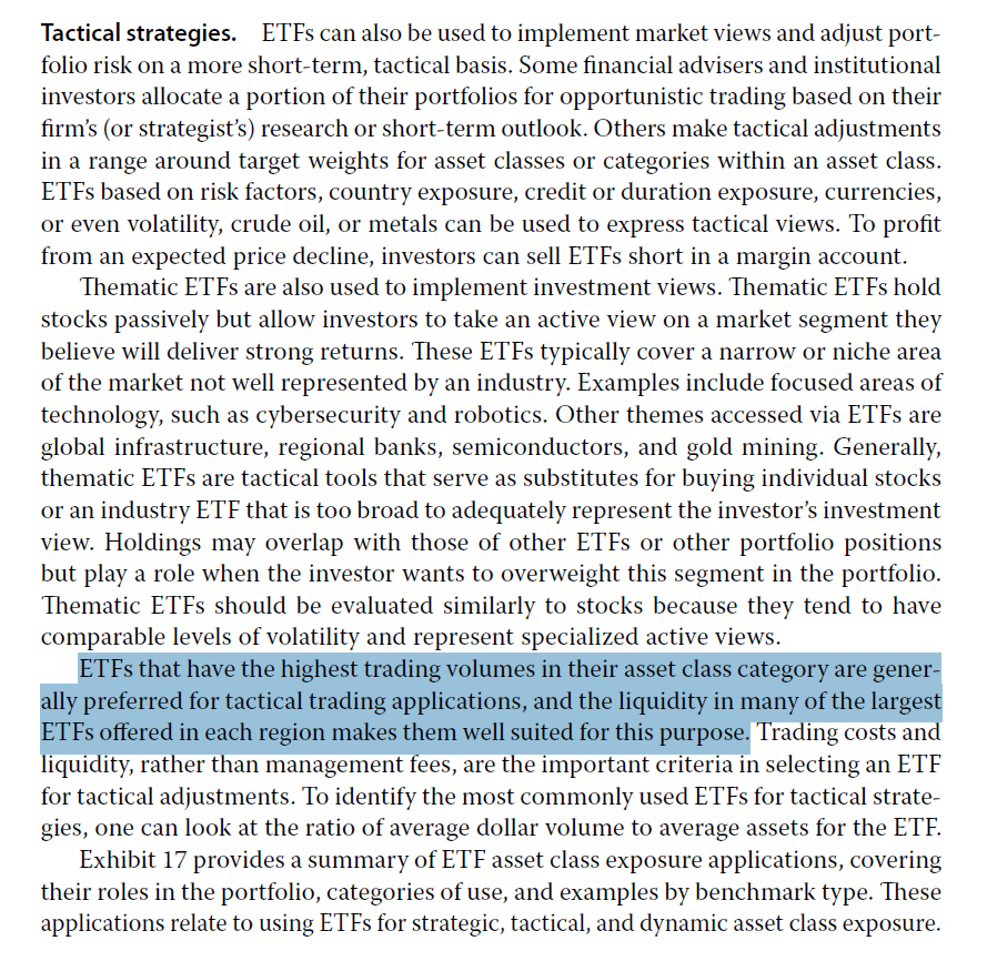 ETFs that have the highest trading volumes in their asset class category are generally preferred for tactical trading application.这句话该怎么理解 经典题303页23题。